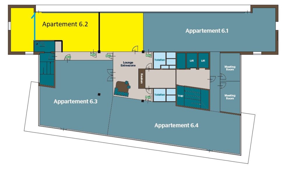 De 6e etage is opgesplitst in 4 nette Business Apartments, je deelt deze etage dus met 3 andere professionele huurders. Op de etage is een keuken en een tweetal vergaderruimtes aanwezig, deze deel je met de mede huurders.